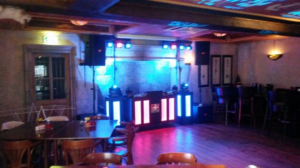 Het nieuwe DJ-Meubel met led-verlichting en twee losse led-zuilen is klaar. Vier movingheads er op, 2 x 4 'discolampen' ernaast en op de achtergrond het witte sterretjesdoek. Een luxe presentatie voor een basisprijs. Maar het belangrijkste is en blijft de sfeer.